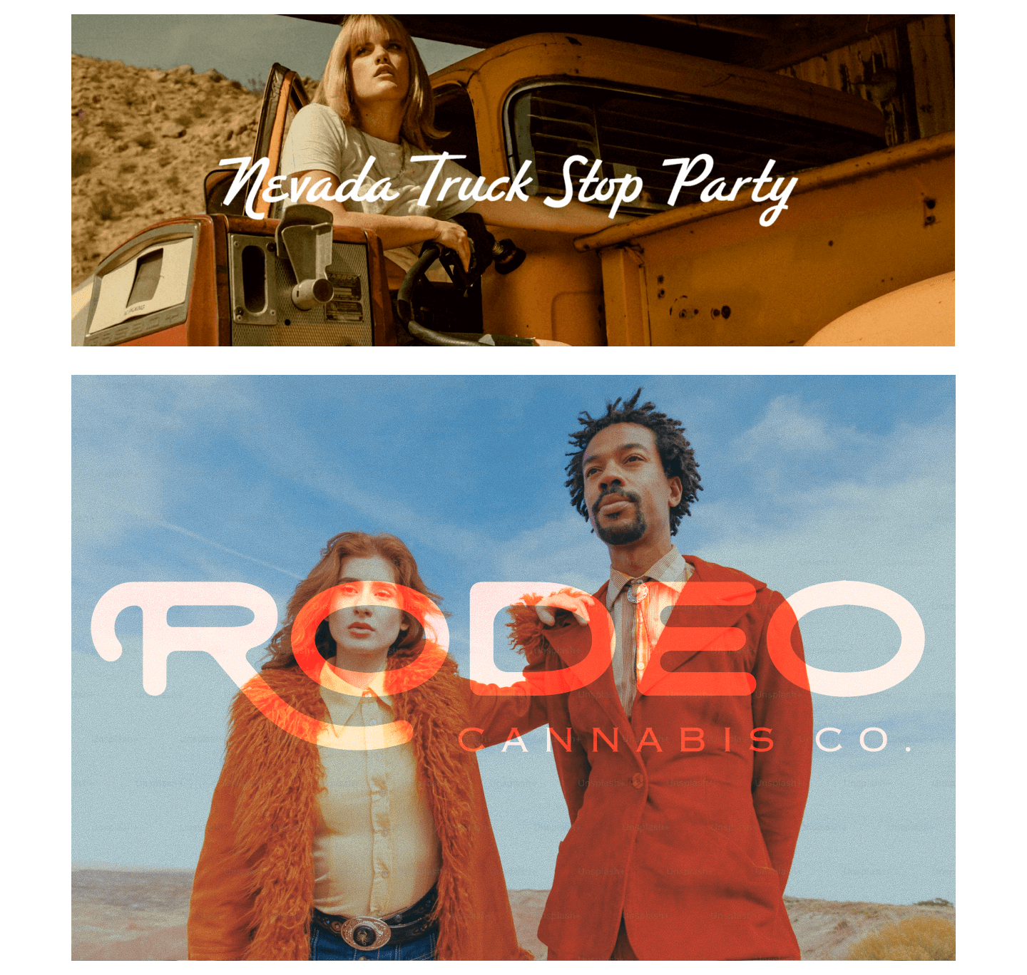Nevada Truckstop Motel Party is bold, high-energy, and unapologetically loud. Inspired by neon motel signs, desert highways, and late-night roadside chaos, it uses saturated color, expressive typography, and collage-style visuals to capture the grit and humor of roadside Americana. This direction leans into spontaneity and excess, positioning the brand as playful, rebellious, and impossible to miss.